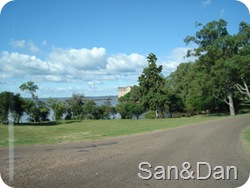 Muito calor, as nuvens começavam a se agrupar novamente. Fomos para Paysandu, fizemos compras num supermercado grande, câmbio P$ 10,20 por R$ 1,00. Decidimos por conhecer e ficar uns dias nas termas de Almirón, cerca de 90km distante de Paysandu. A estrada é boa no começo do trecho, mas depois os buracos aumentam. O local é grande, árvores, gramado, bungalows. Novamente, o problema da chuva: a maioria dos espaços próximos ao rio estão alagados e, como a previsão é de mais chuva, optamos por ficar próximos à piscina coberta e sanitários. Havia apenas mais 02 barracas acampadas.